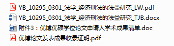 1、命名规则:用YB、YS-X、YS-Z分别指代博士、学硕、专硕学位论文类别,文档命名规则:学位论文类别_单位代码_一级学科代码/专业学位类别代码及名称_题目(不含副标题)_LW,如我校推荐上报的某篇博士学位论文,则命名为:YB_10295_0301_法学_经济刑法的法益研究_LW。