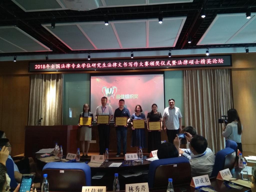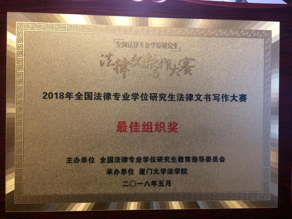 2018年5月20日,2018年全国法律专业学位研究生法律文书写作大赛暨法律硕士精英论坛在厦门大学举行,大赛由全国法律专业学位研究生教育指导委员会主办。星空游戏免费入口荣获“2018年全国法律专业学位研究生法律文书写作大赛优秀组织奖”,司法部国家司法考试司巡视员姜晶为获奖单位颁奖。我校与中国人民大学、南京师范大学等5所高校从135所参赛高校中脱颖而出,这也是法学院首次获得全国法律类竞赛集体奖项。