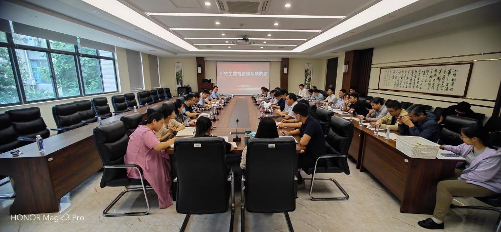 设计学院、物联网工程学院、机械工程学院、马克思主义学院、商学院、人文学院研究生教育分管院长、导师代表、研究生秘书、研究生辅导员,研工部、研究生院全体负责人、各科室主任参加了调研会。