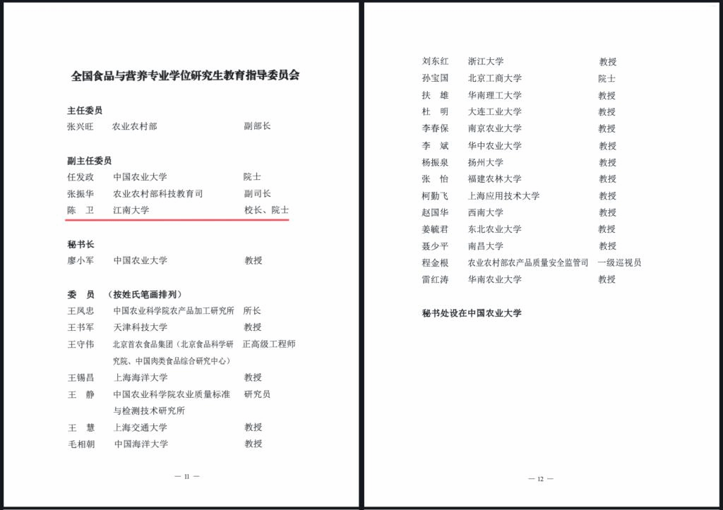 近日,国务院学位委员会、教育部、人力资源社会保障部联合下发《关于成立和调整全国应用伦理等 12 个专业学位研究生教育指导委员会的通知》(学位﹝2023﹞7号),决定成立食品与营养等9个专业学位研究生教育指导委员会(以下简称教指委),调整中医中药针灸、艺术2个教指委,合并组建风景园林教指委。我校陈卫教授当选全国食品与营养专业学位研究生教育指导委员会副主任委员,魏洁教授当选全国设计专业学位研究生教育指导委员会委员。这是我校教授首次当选全国专业学位研究生教育指导委员会副主任委员,也是我校首次两位教授同时当选该委员会委员,表明我校专业学位研究生教育能力和水平的有效提升。