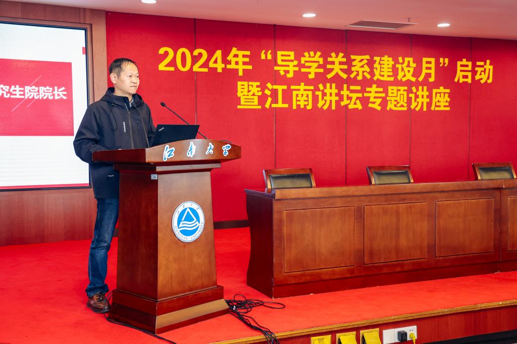 大会伊始,党委研工部部长、研究生院院长吴小俊致辞,吴院长向所有到场的导师和同学们表示热烈的欢迎。他提到导学关系,是以学术共生为基础、以学术共情为纽带、以学术共进为目标的师生交往关系,是研究生教育培养过程中至关重要的一环。研究生导师在研究生学习中肩负着非常重大的责任,导学关系建设活动设立的初衷就是为了进一步明确研究生导师立德树人职责,营造良好的导学互动氛围。吴院长对在场的学生提出三点要求:一是要学会尊重,作为学生最基本的素养就是尊师重道;二是要学会学习,只有学会学习,才能具备在科研领域持续深耕的能力;三是要追求卓越,要有攀登世界科学高峰的信心,不断提升原始创新能力。对在场导师提出三点期望:一是要将培养学生放在首要位置,要专注于学生的专业基础、批判的科学精神和科研习惯养成;二是要将学生的身心健康放在突出位置,在关注学生学业成长的同时关注学生的身心健康;三是要将以德育人放在关键位置,为人师者要注重德才兼备,不仅要授学生“谋事之才”,更要传学生“立世之德”。接着,党委研工部副部长、研究生院副院长陈周发布了2024年“导学关系建设月”主题系列活动,吴小俊院长为陈明选教授、赵建新教授颁发江南讲坛特约专家聘书。