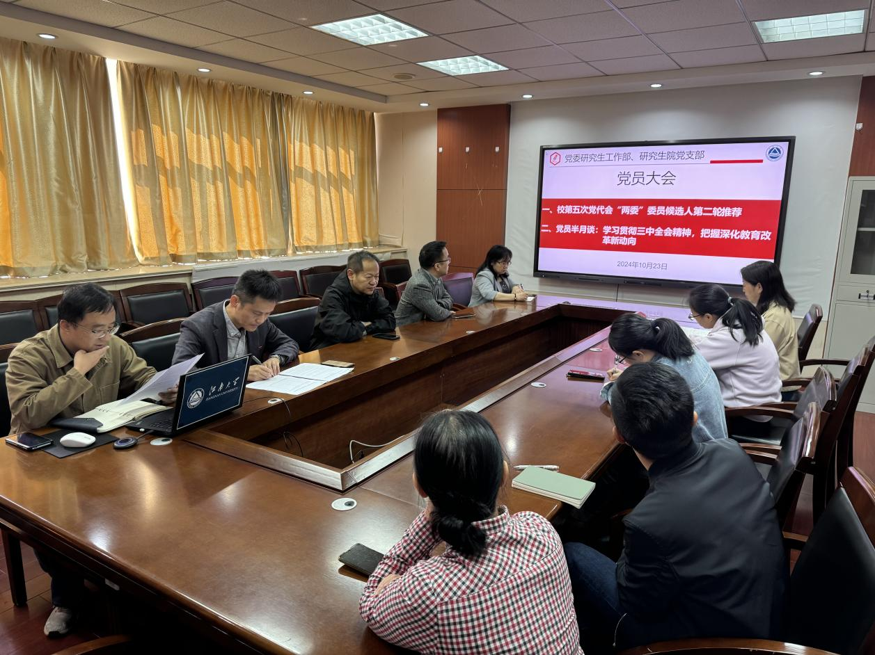 10月23日,党委研究生工作部、研究生院党支部在A524会议室举行党的二十届三中全会精神专题学习会暨“党员半月谈”第六期活动,学习传达贯彻党的二十届三中全会精神,并部署学校第五次党代会支部相关工作。党支部书记吴小俊及党委研究生工作部、研究生院、卓越工程师学院全体党员参与了此次会议,会议由党支部组织委员高鋆主持。