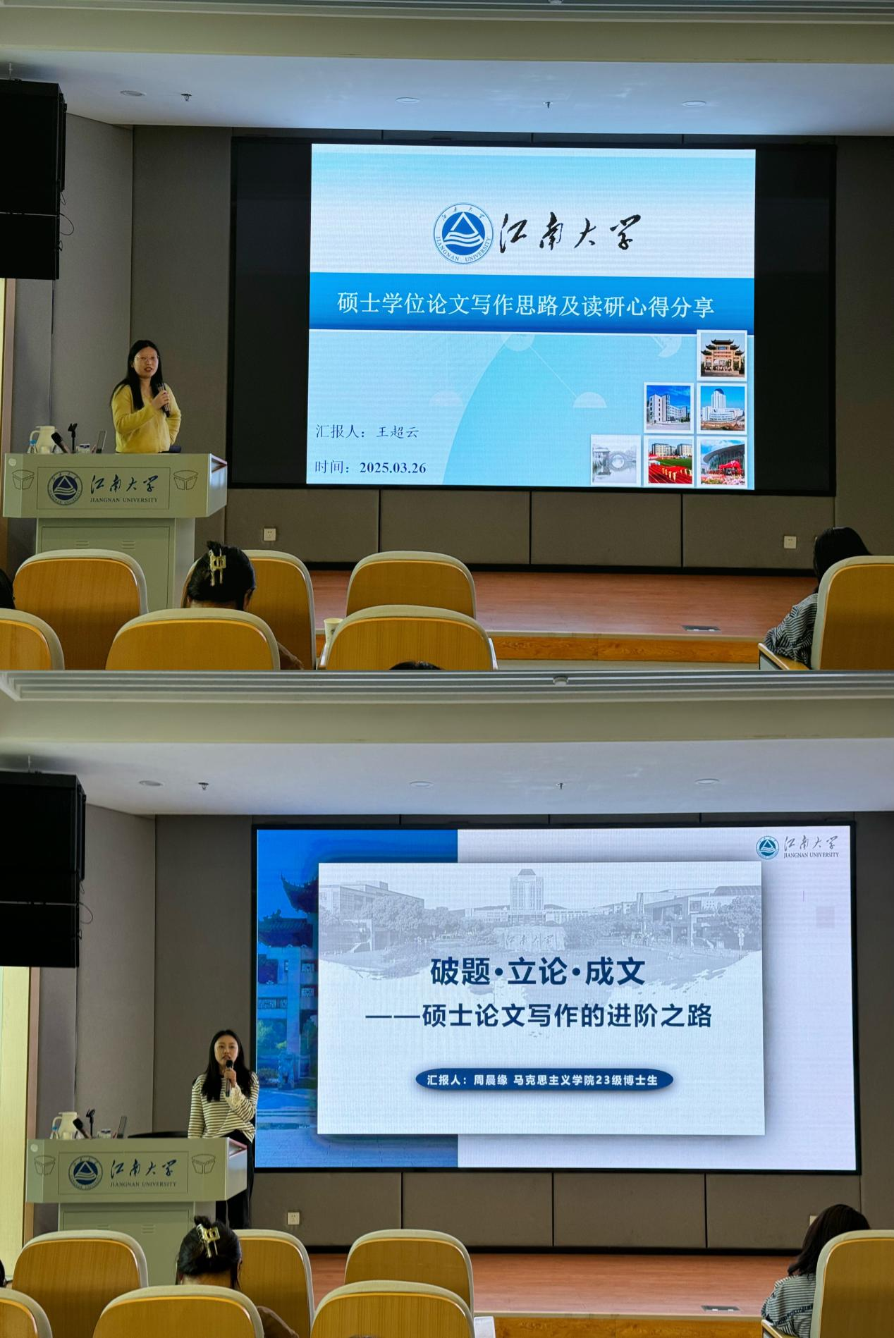 随后,论文写作经验分享专题讲座正式开讲,王超云围绕心理建设、论文框架搭建和写作方法、心得体会作《硕士学位论文写作思路及读研心得分享》报告;周晨缘聚焦选题与问题提出、理论构建与论证、论文写作与润色作《破题·立论·成文——硕士论文写作的进阶之路》报告。活动现场气氛热烈,参会同学认真聆听,积极交流,纷纷反映收获颇丰。
