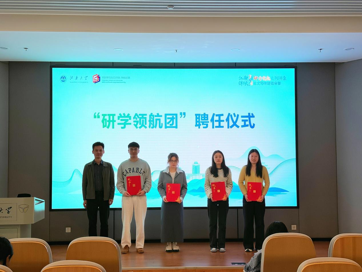 接着,陈周为食品学院博士生毛继贤、设计学院博士生潘临凡、环境与生态学院博士生王超云、马克思主义学院博士生周晨缘颁发“研学领航团”聘书。