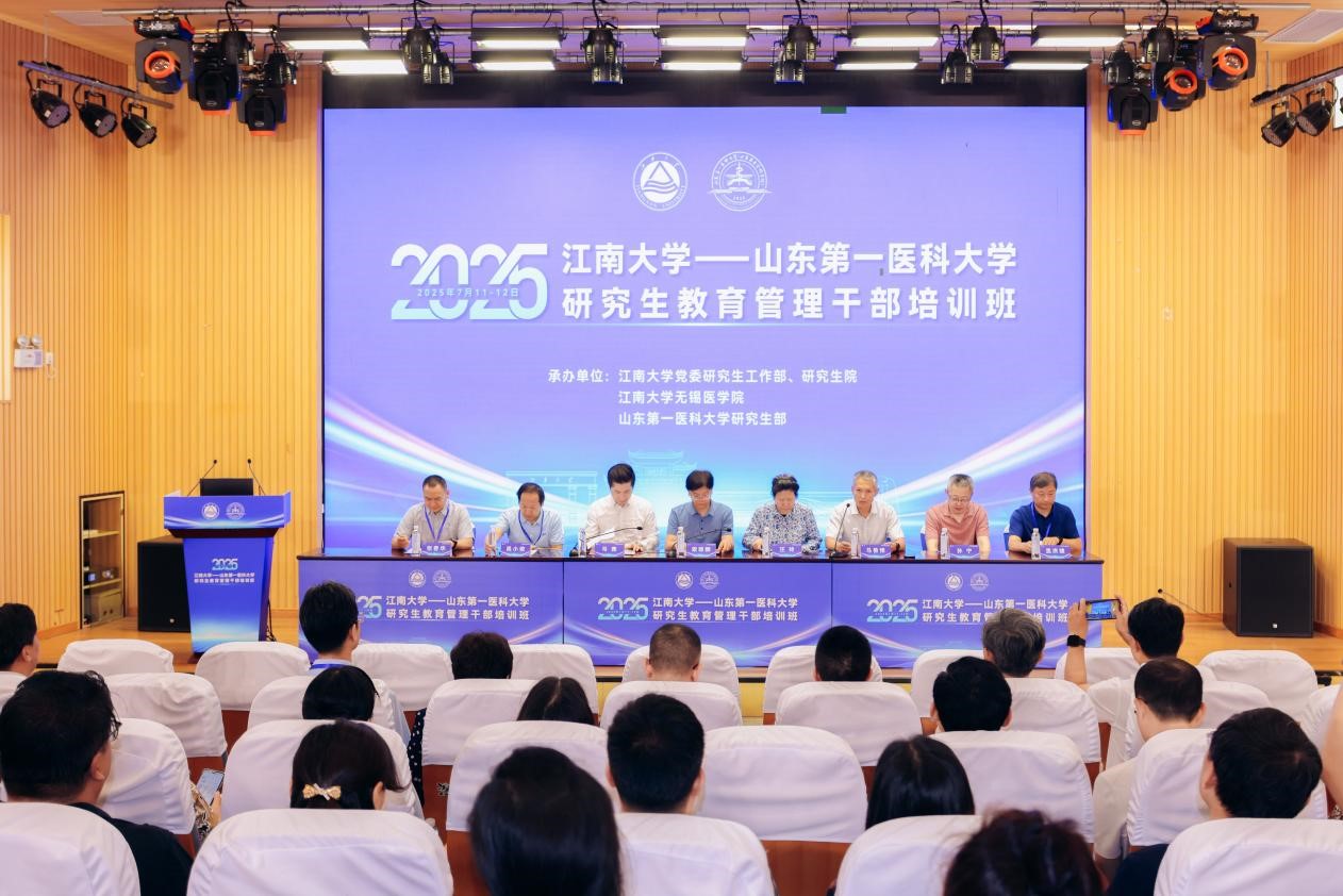 7月11日,江南大学和山东第一医科大学联合举办的“2025年研究生教育管理干部培训班”在无锡开班。中国学位与研究生教育学会秘书长、清华大学副教务长、研究生院院长、国家卓越工程师学院院长梁琼麟,中国学位与研究生教育学会医药科工作委员会副主任、复旦大学克卿书院院长汪玲,星空游戏免费入口党委常委、副校长马鑫,山东第一医科大学(山东省医学科学院)党委委员、副校(院)长、星空游戏免费入口校长助理(挂职)马鲁豫出席开班式。两校共150余名研究生教育管理骨干参加了培训班。开班仪式由马鲁豫主持。